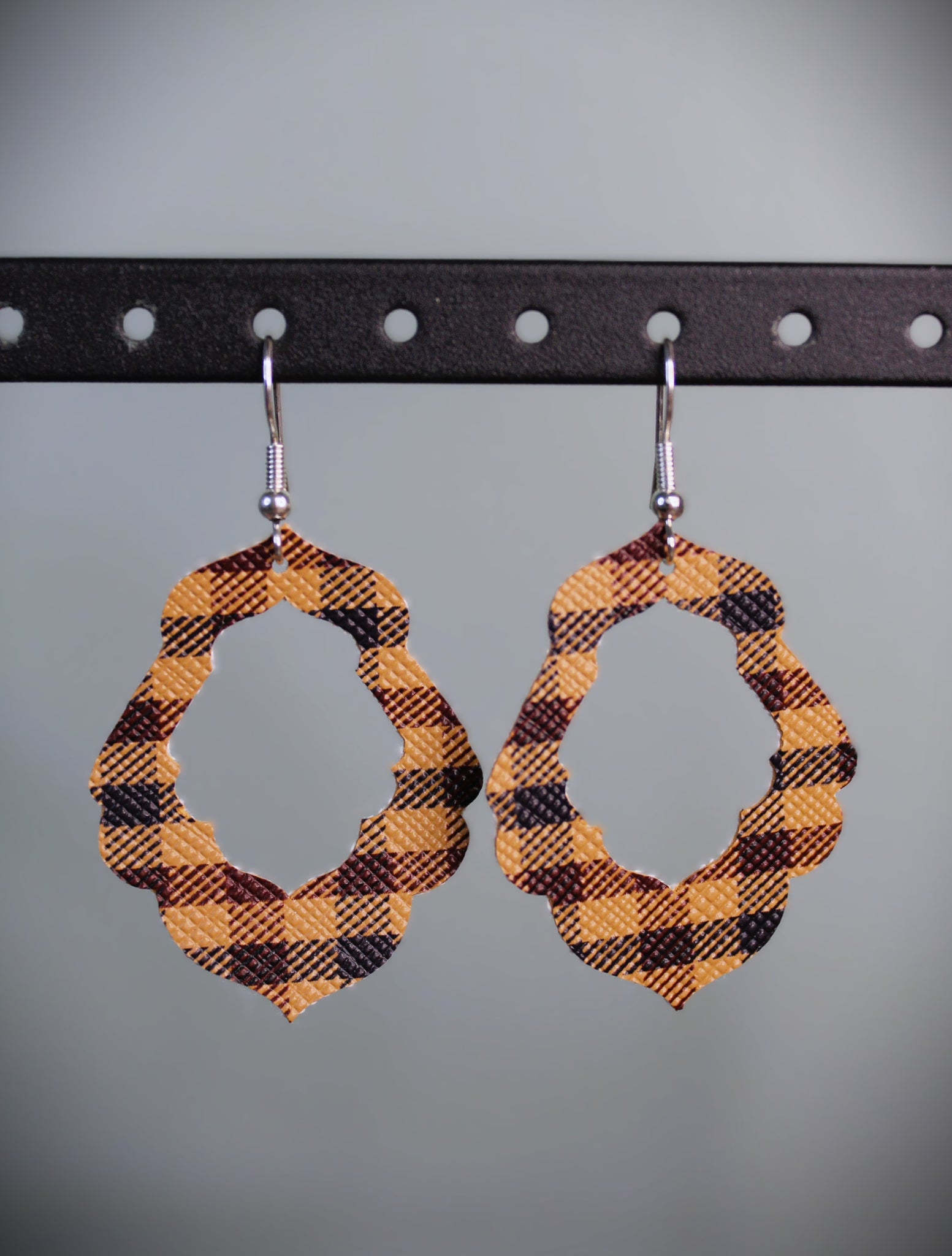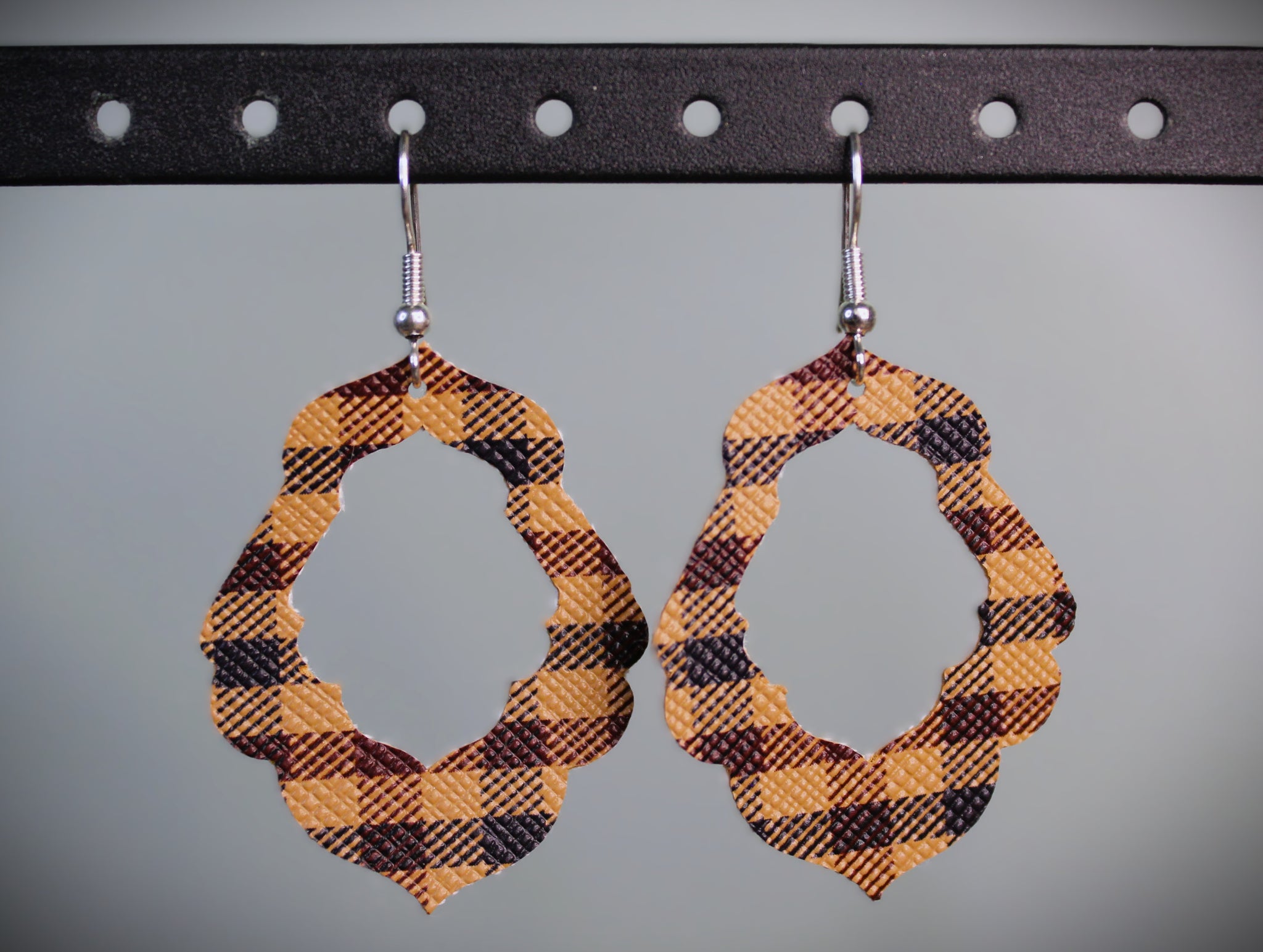 Light brown plaid faux leather earrings with a warm, rustic look. Lightweight, easy to wear, and perfect for adding a subtle western touch to any outfit.