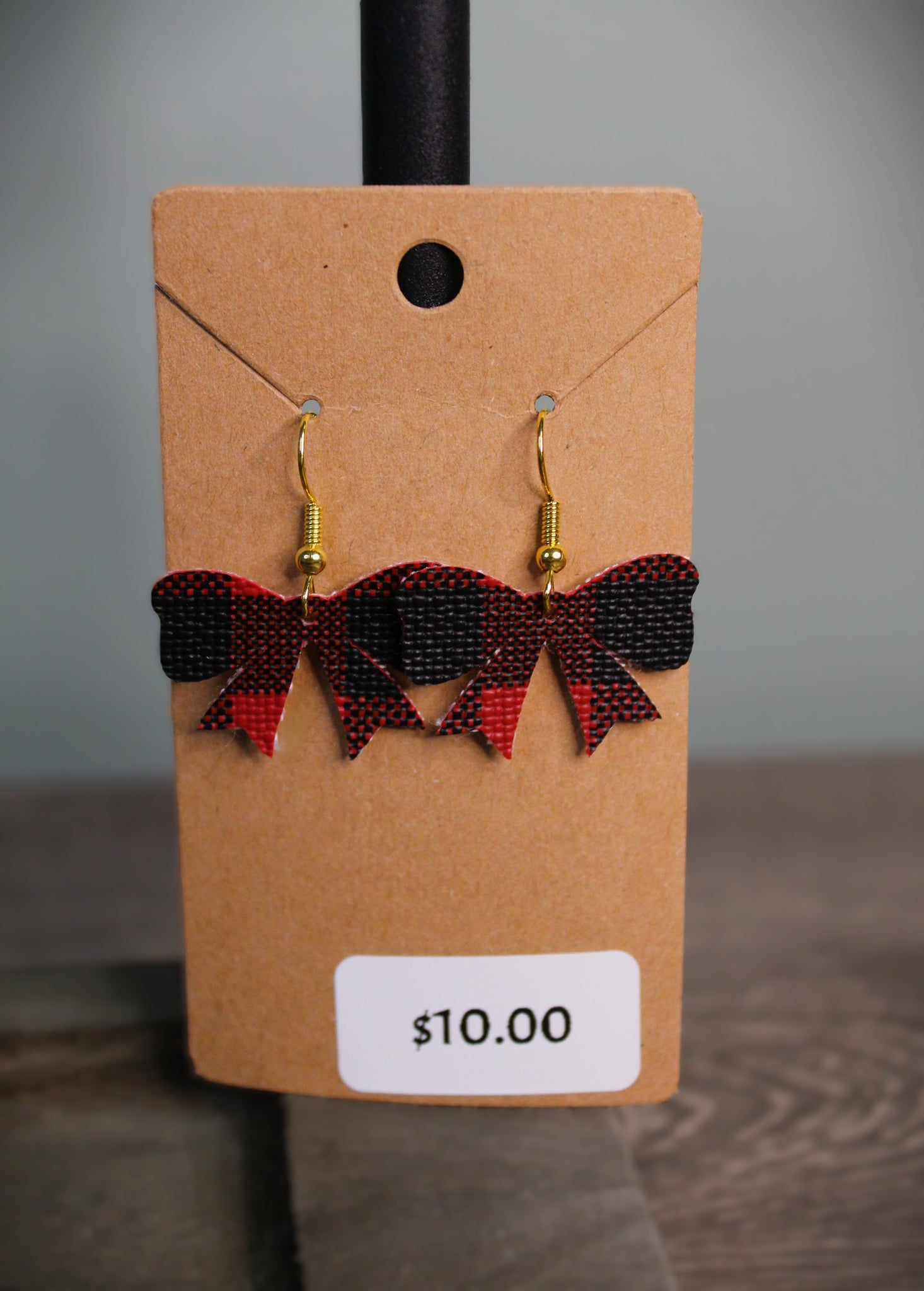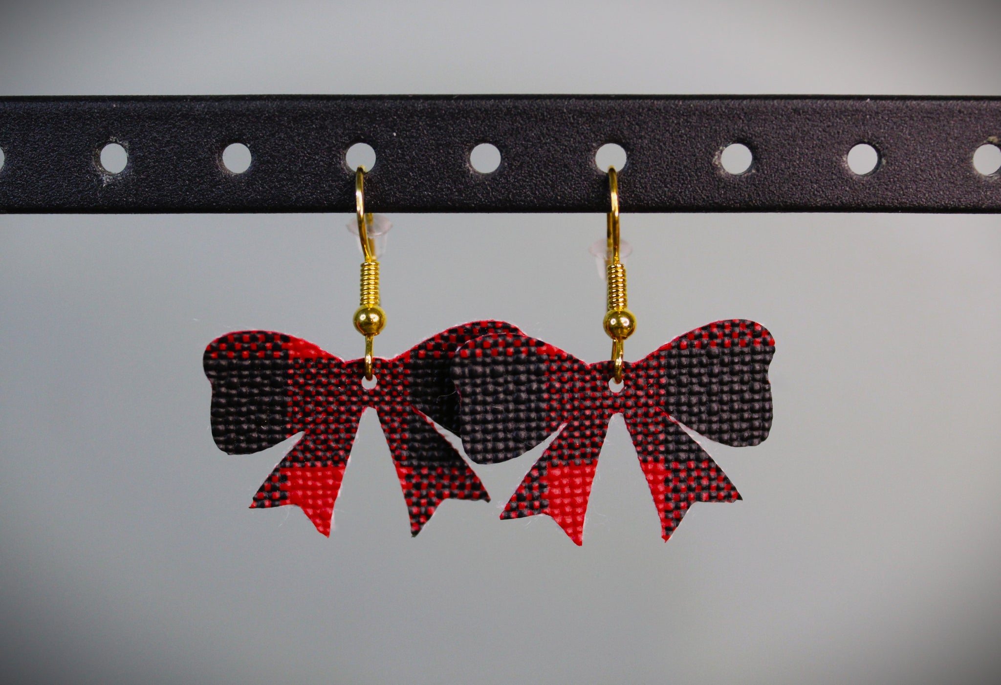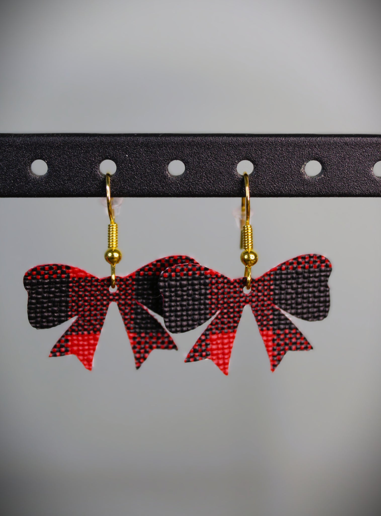 Add a touch of rustic charm with these red and black plaid bow earrings, crafted from lightweight faux leather for all‑day comfort. The classic plaid pattern brings a cozy, western‑inspired feel, while the bow shape adds a playful, feminine touch. Perfect for everyday wear, holiday outfits, or anyone who loves a little country flair