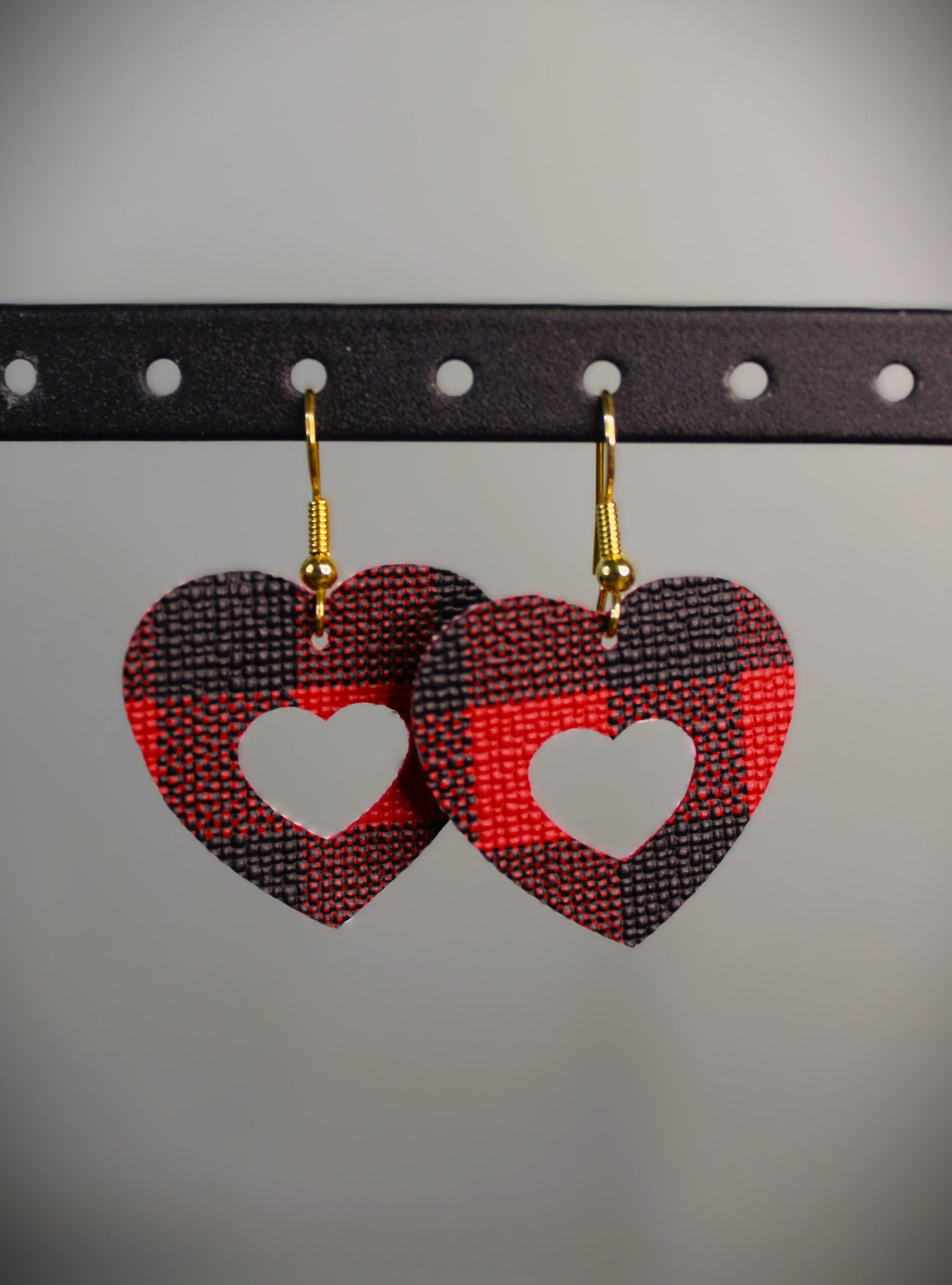 Black and red plaid heart earrings crafted from lightweight faux leather.