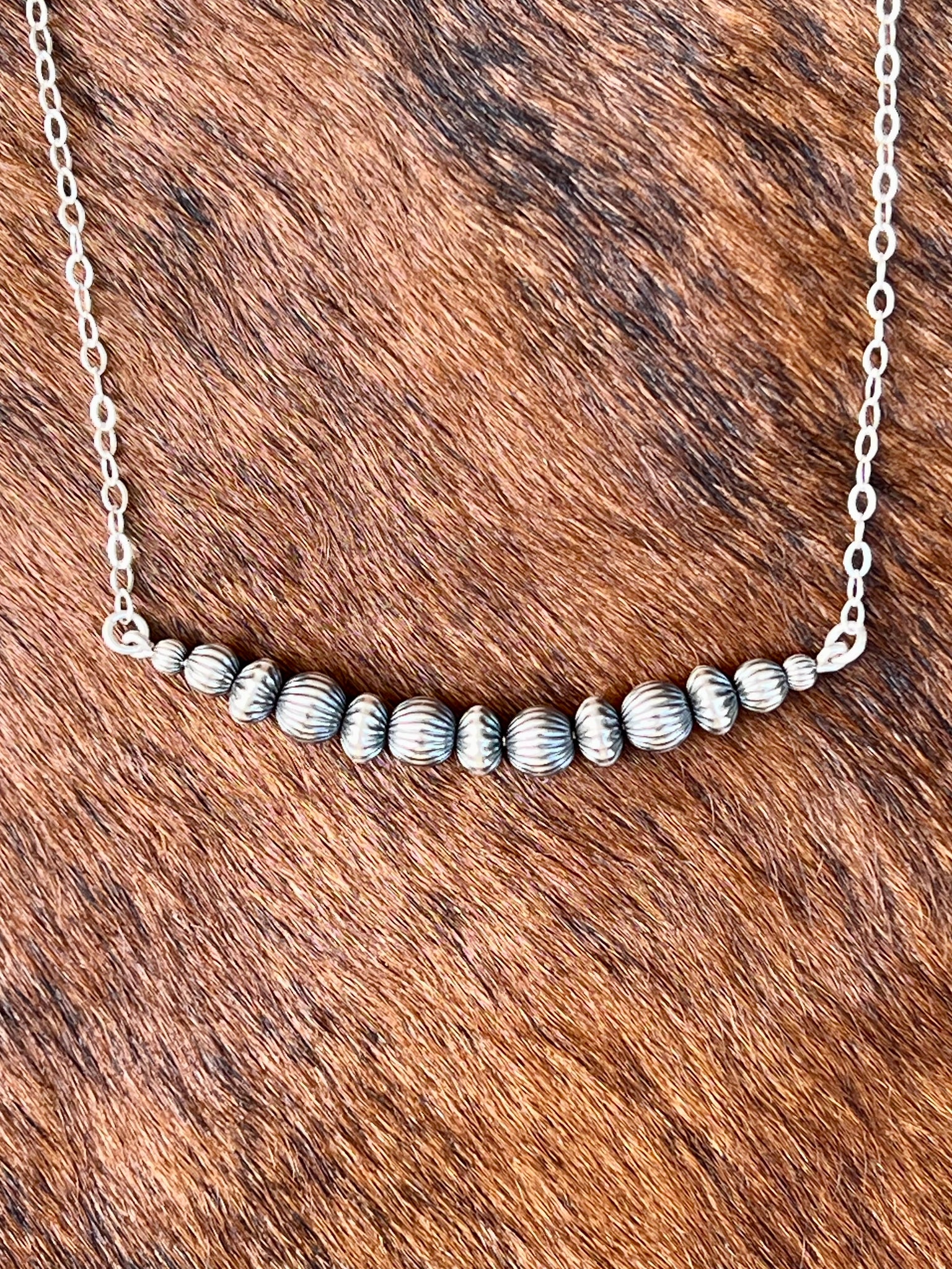This handcrafted necklace showcases a sterling silver bar adorned with authentic corrugated Navajo beads. The textured silver catches the light with subtle brilliance, offering a minimalist yet distinctive accent. Perfect for layering or wearing solo, this piece blends traditional Southwestern craftsmanship with modern elegance.