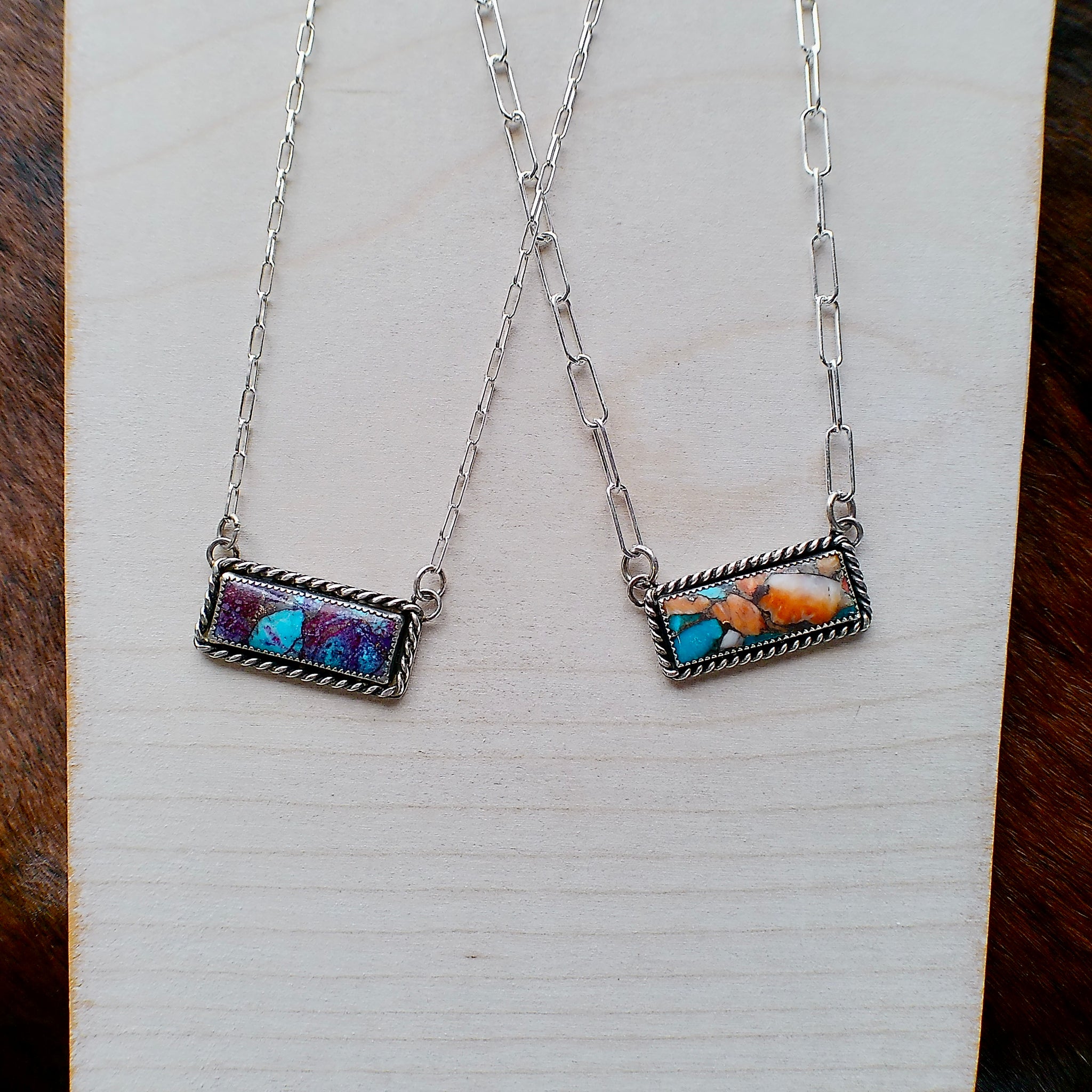 Handcrafted in Alberta, these sterling silver necklaces feature vibrant stones from the Kingman Turquoise Mine – each framed in a twisted rope bezel and suspended from a 20” sterling chain. Choose between the Purple Mohave or the Orange Spiny Oyster. Each pendant is approximately 1-3/8" Long x 5/8" Tall.