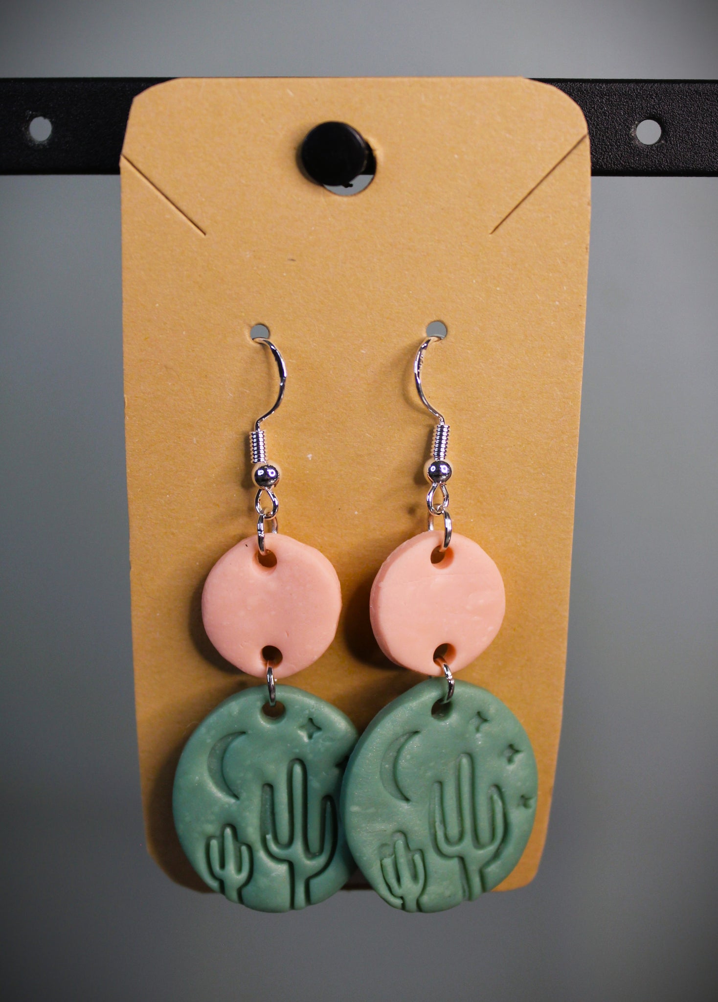 Handcrafted from polymer clay, these earrings feature a soft peachy pink circle paired with a sage green drop embossed with a desert night scene—cacti, stars, and a crescent moon. Lightweight and finished with silver-toned hooks, they offer a subtle nod to southwestern style with a modern, artistic edge.