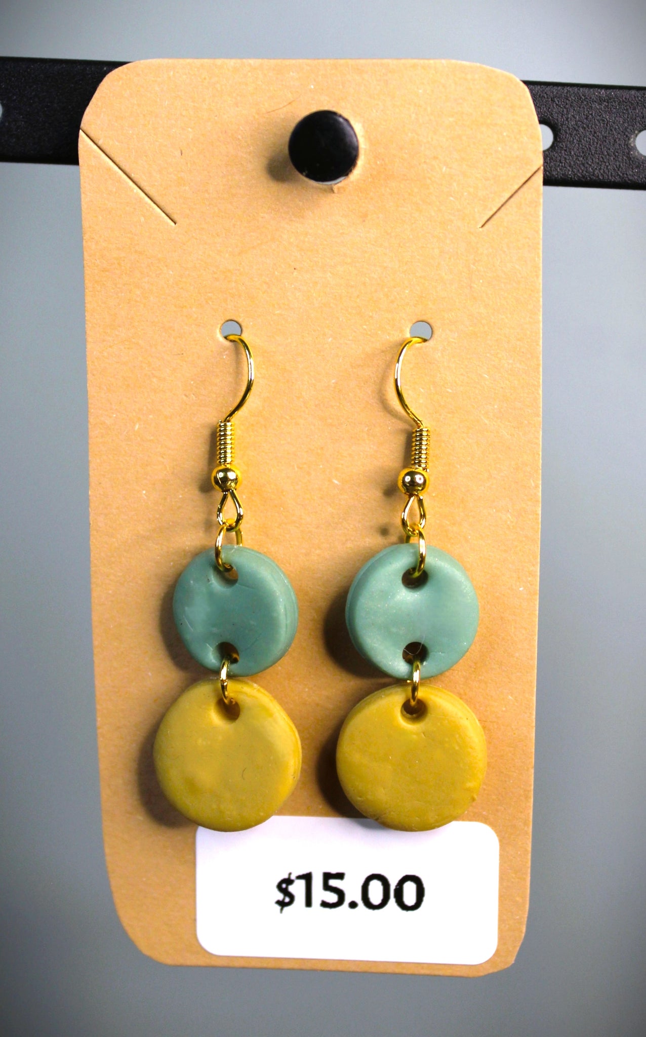 Sleek and simple. These lightweight polymer clay earrings feature stacked circular forms in sage and mustard, accented with gold-toned hardware. Their clean silhouette and subtle color contrast make them a versatile, everyday accessory.